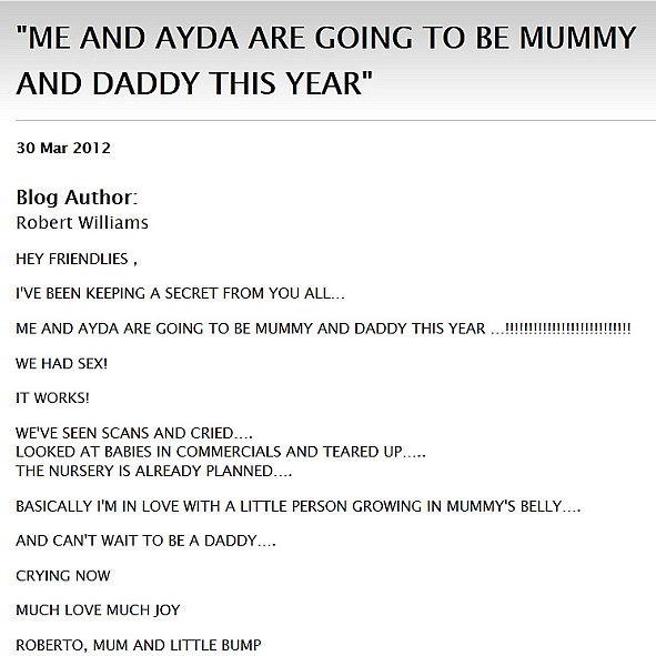 Ο Robbie Williams ανακοίνωσε μέσω της ιστοσελίδας του ότι θα γίνει πατέρας για πρώτη φορά.