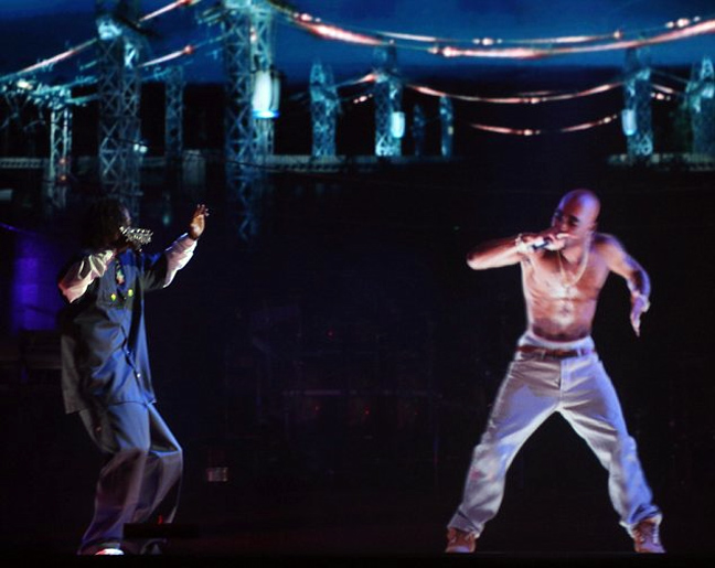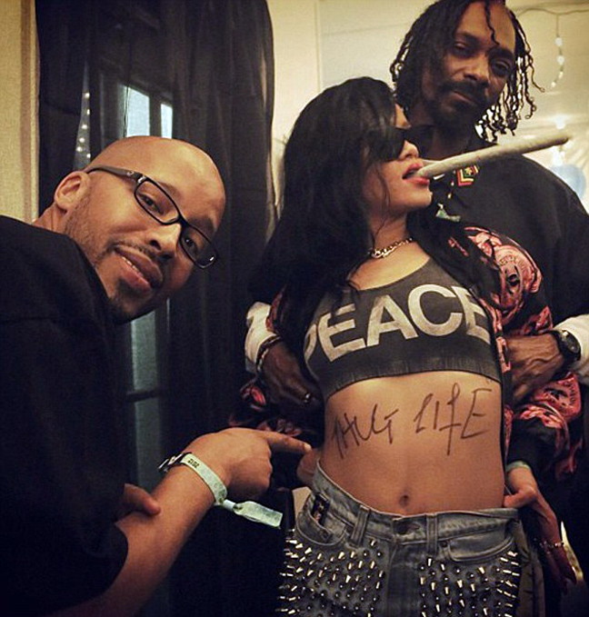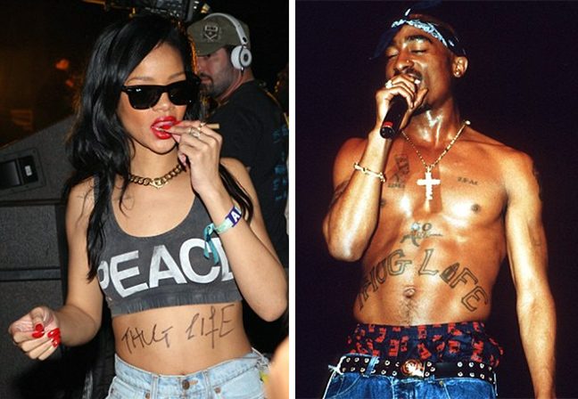 Η Rihanna ενθουσιάστηκε όταν οι Dr Dre και Snoop Dogg βγήκαν στη σκηνή συνοδεία ενός ολογράμματος του ράπερ Tupac Shakur και δεν παρέλειψε να αποτίσει και η ίδια τον δικό της φόρο τιμής στο φεστιβάλ Coachella γράφοντας «Thug Life» στην κοιλιά της.