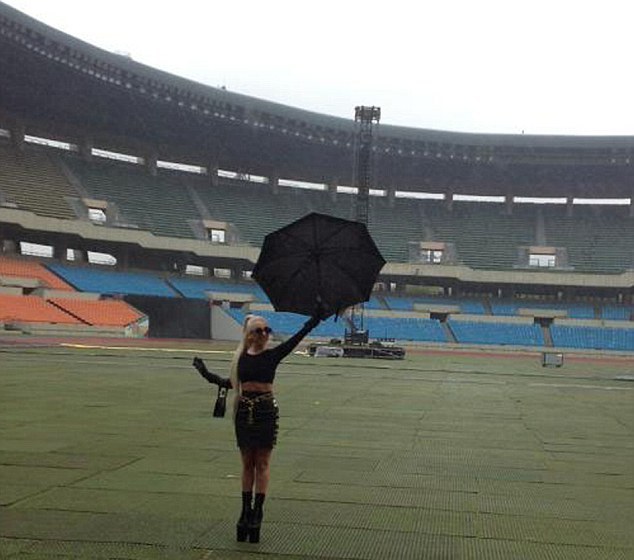 Φορώντας τακούνια, διχτυωτό καλσόν και με την βλεφαρίδα κάγκελο, η δημοφιλής τραγουδίστρια δεν δίστασε να πάρει το τρυπάνι και να δουλέψει μαζί με το συνεργείο για την κατασκευή της σκηνής, πάνω στην οποία θα τραγουδήσει στη Ν. Κορέα.