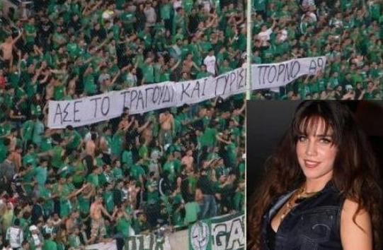 Με το σύνθημα «εεε, οοο, άσε το τραγούδι και γύρισε πορνό», οι οπαδοί της Ομόνοιας αποδοκίμασαν την Ελληνίδα τραγουδίστρια, ενώ σήκωσαν και το ανάλογο πανό.