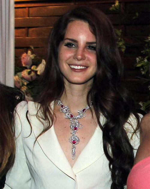 Lana Del Rey, η Αμερικανίδα τραγουδίστρια φόρεσε ένα ζευγάρι σκουλαρίκια σε λευκό χρυσό με ρουμπελίτες τουρμαλίνες σε σχήμα καρδιάς (10.25 καράτια), γκρίζα διαμάντια, ροζ διαμάντια, μαύρα διαμάντια και διαμάντια και onyx chalcedonies και ενα κολιέ σε λευκό χρυσό με heart shaped rubellite tourmalines (36.70 καράτια), γκρί διαμάντια (67.52 καράτια) ροζ διαμάντια, διαμάντια, μαύρα διαμάντια, onyx chalcedonies και τα δύο από την συλλογή Animal World.