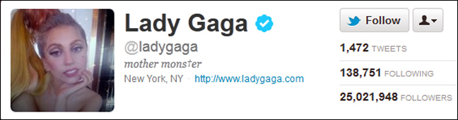 Ο πρώτος άνθρωπος που ξεπερνά το όριο των 25 εκατ. εγγεγραμμένων (followers) στο λογαριασμό του στο Twitter είναι η αμερικανίδα ποπ σταρ Lady Gaga.