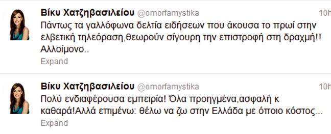 Και πρόσθεσε: «Πάντως τα γαλλόφωνα δελτία ειδήσεων που άκουσα το πρωί στην ελβετική τηλεόραση, θεωρούν σίγουρη την επιστροφή στη δραχμή. Αλλοίμονο…»