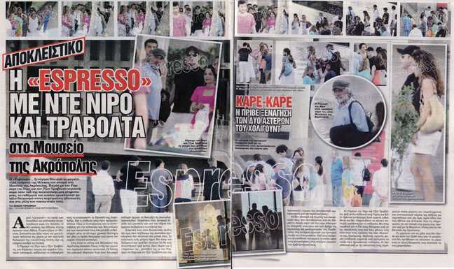 Στο Μουσείο της Ακρόπολης βρέθηκαν δύο από τα μεγαλύτερα ονόματα της Μέκκας του κινηματογράφου. Ο Ρόμπερτ ντε Νίρο και ο Τζον Τραβόλτα αφού «όργωσαν» τα νησιά των Κυκλάδων και απόλαυσαν τα καταγάλανα νερά του Αιγαίου, έφτασαν στην Αθήνα και όπως βλέπετε από το αποκλειστικό δημοσίευμα της εφημερίδας «Espresso», ξεναγήθηκαν στο Μουσείο της Ακρόπολης.