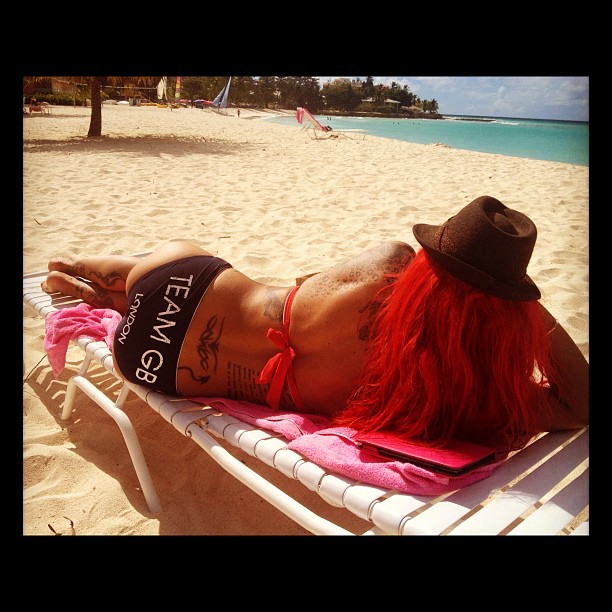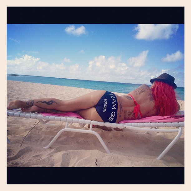 Τιμά όμως την πατρίδα με το πατριωτικό GB μαγιό της… ένα από την πλούσια συλλογή της.