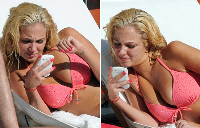 Η ξανθιά, πλέον, ηθοποιός δείχνει κάπως προβληματισμένη με ένα μήνυμα στο κινητό της. Αφού το διάβασε κάμποσες φορές, δεν θέλησε να προβληματιστεί περισσότερο κι έτσι άφησε το κινητό της στην άκρη για να απολαύσει την ηλιοθεραπεία της.