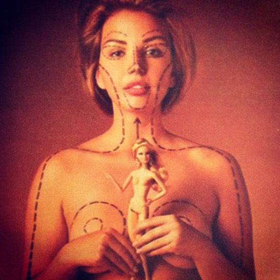 Μια πανέμορφη γυναίκα, σημαδεμένη σε πρόσωπο και σώμα με τον μαρκαδόρο του πλαστικού χειρουργού, λίγο πριν την κόψει το νυστέρι. Κρατά στα χέρια της μια πλαστική κούκλα.