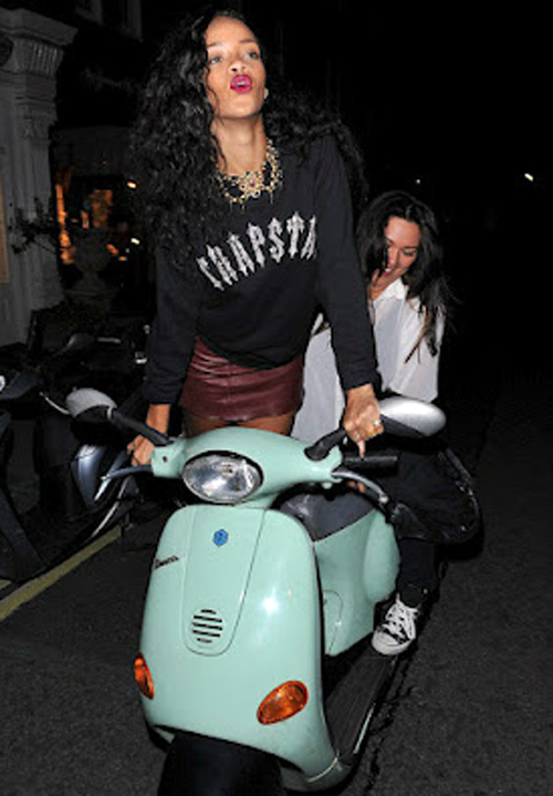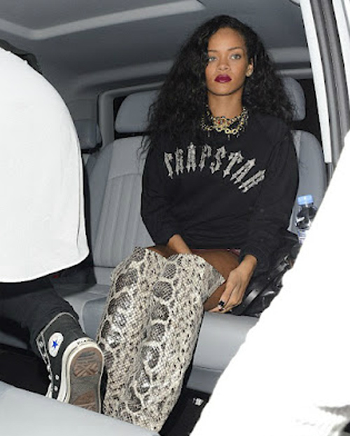 Το πιο πρόσφατο στιλιστικό ατόπημα τής Rihanna ήταν στο Λονδίνο. Η τραγουδίστρια φόρεσε ένα ζευγάρι ψηλές μπότες από δέρμα φιδιού, μια κόκκινη δερμάτινη φούστα και όλα αυτά τα συνδύασε και με ένα μαύρο φαρδύ φούτερ.