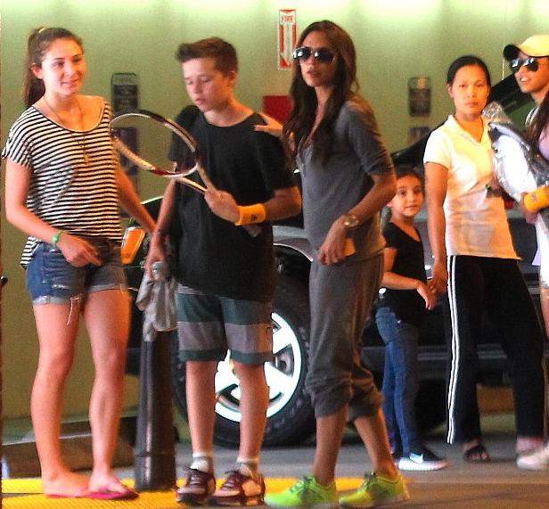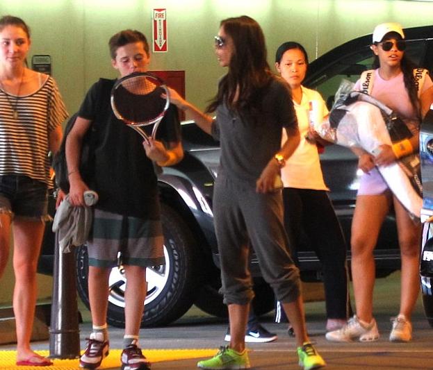 Φορώντας μια γκρι φαρδιά φόρμα, μεγάλα μαύρα γυαλιά και κρατώντας το κινητό στο χέρι η Βικτόρια έδινε οδηγίες στον μεγάλο της γιο, Brooklyn, για το πώς να κρατάει τη ρακέτα του τένις.