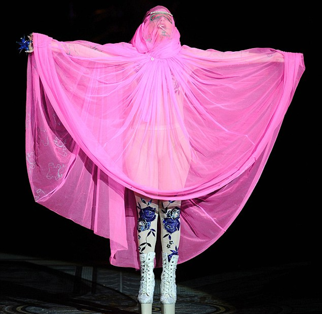 Η εμφάνισή της εκτός πασαρέλας ήταν ίσως πιο εκκεντρική κι από την εμφάνισή της πάνω στην πασαρέλα, με μία φουτουριστική ροζ κάπα.
