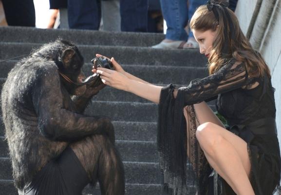 Πώς βρέθηκε τώρα ο χιμπατζής σε ένα τόσο παράταιρο προς τη φύση του περιβάλλον και ρόλο… κανείς δεν ξέρει.