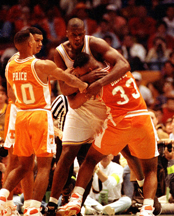 Ο O’Neal πατάει γερά και απογειώνεται για κάρφωμα, στον αγώνα με το Tennessee (1991).
