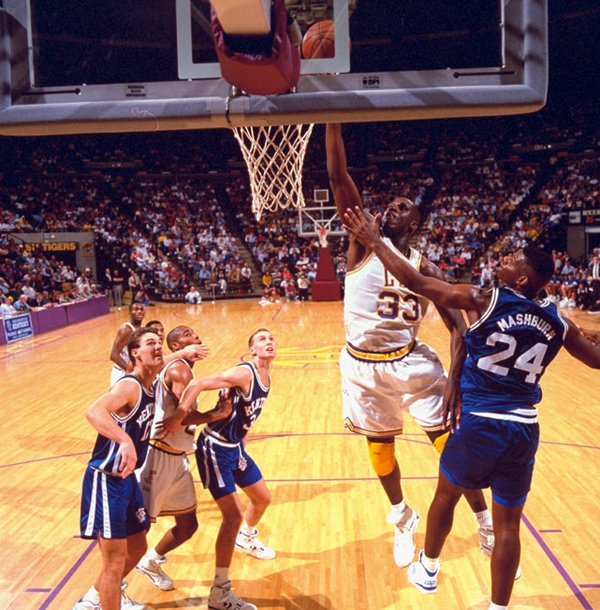 Ο Shaq καρφώνει στη μούρη του Jamal Mashburn στο ματς Kentucky-LSU (1992). Και μάλιστα έφυγε από το LSU με 61% ευστοχία εντός παιδιάς (δεύτερο καλύτερο ρεκόρ όλων των εποχών για το LSU).