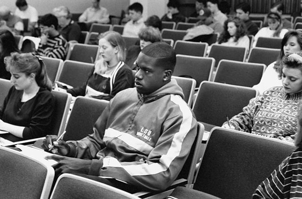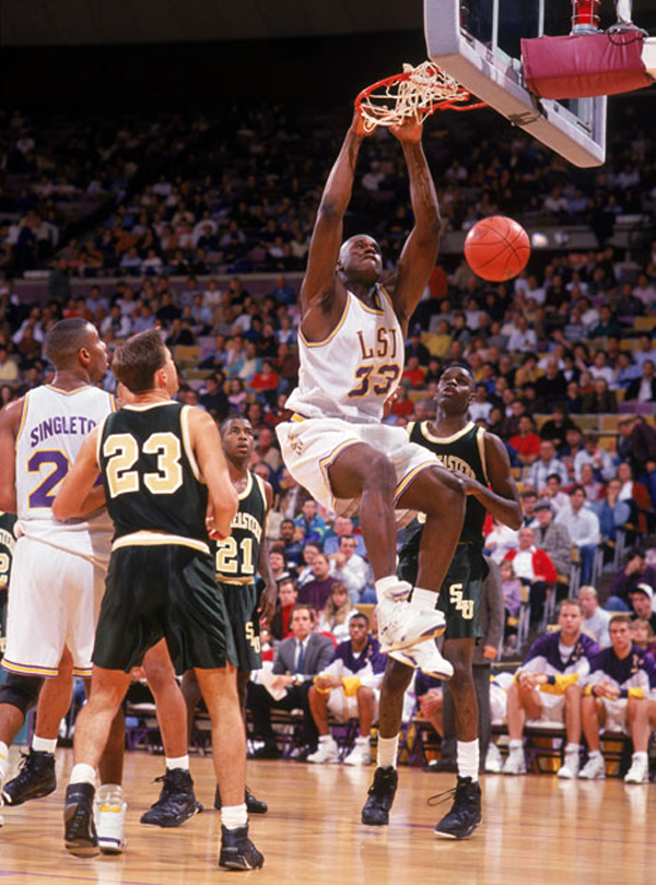 Από τις πρώτες φορές που ο Shaq δείχνει στον κόσμο το κάρφωμα-σήμα κατατεθέν του! Εδώ σε αγώνα εναντίον της Southeastern Louisiana το 1991.