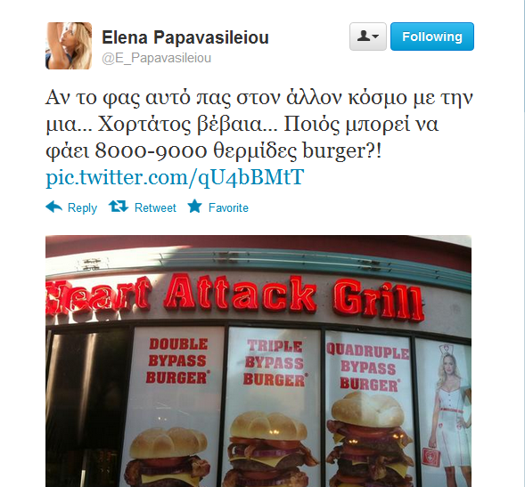 Ένας από αυτούς τα τεράστια burgers, τα οποία όμως δεν τόλμησε να τα δοκιμάσει. Με χιούμορ ανάρτησε τη σχετική φωτογραφία, σχολιάζοντας: «Αν το φας αυτό, πας στον άλλο κόσμο με τη μία… Χορτάτος βέβαια. Ποιος μπορεί να φάει 8.000-9.000 θερμίδες burger;!» είπε, ανεβάζοντας παράλληλα και τη σχετική φωτογραφία.