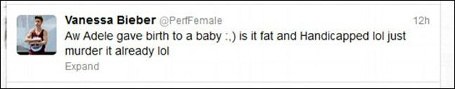 «Μπλιαχ… Η Adele έκανε μωρό. Είναι χοντρό και ανάπηρο; Έπρεπε απλά να το έχετε ήδη δολοφονήσει» ήταν το σχόλιο ενός χρήστη.
