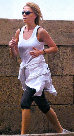 Κρυμμένη πίσω από τα μαύρα γυαλιά της και φορώντας αθλητικά ρούχα, η γνωστή παρουσιάστρια βγαίνει από το σπίτι της και αρχίζει να προθερμαίνεται. Είναι ρουτίνα άλλωστε για την ίδια να κάνει τζόκινγκ στην περιοχή γύρω από το σπίτι της καθώς έτσι διατηρείται σε φόρμα.