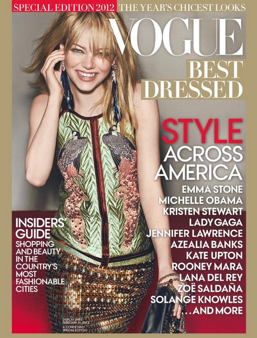 Η Έμμα Στόουν επελέγη από την αυστηρή Vogue ως η πιο καλοντυμένη γυναίκα για το 2012. H πρώην κοκκινομάλλα και νυν ξανθιά ηθοποιός κλέβει τις καρδιές, όχι μόνο με τις υποκριτικές της ικανότητες και το ταμπεραμέντο της, αλλά και με τις στυλιστικές επιλογές της. Η Emma ξέρει τι θα πει στυλ υψηλού επιπέδου και η Vogue την επιβράβευσε γι’ αυτό.