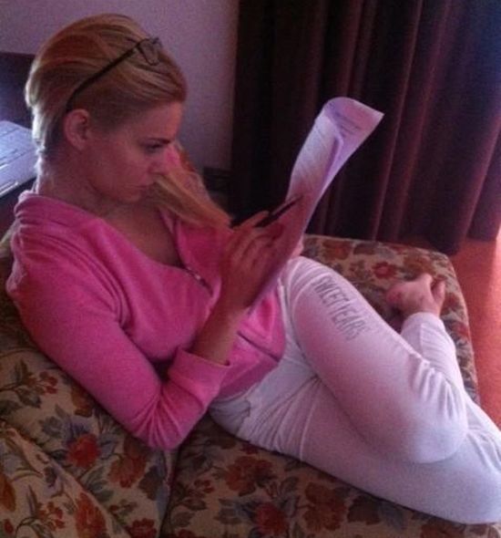 Για του λόγου του αληθές, ιδού η φωτό της Ρίας, με φόρμα και με τις σημειώσεις ανά χείρας στον καναπέ.