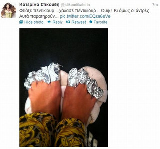 «Φτιάξε πεντικιούρ …χάλασε πεντικιούρ .. Ουφ ! Κι όμως οι άντρες Αυτά παρατηρούν…» έγραψε η όμορφη τραγουδίστρια στο twitter.