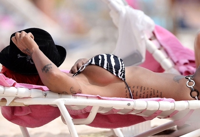 Εδώ την βλέπουμε με ένα ζεμπρέ μπικίνι και μαύρο καπέλο με νεκροκεφαλή σε παραλία στα Μπαρμπάντος ενώ το στήθος της δεν άντεξε στο πάνω μέρος του μπικίνι της και βγήκε δειλά-δειλά.