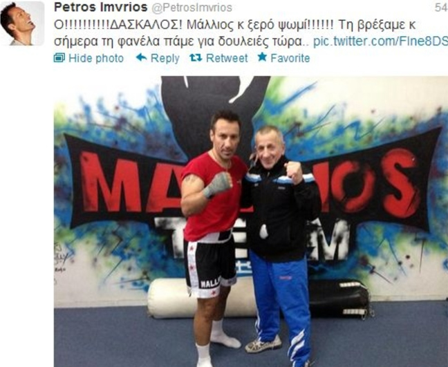 Ο τραγουδιστής όταν βρίσκει ελεύθερο χρόνο προπονείται στο Muay Thai, ενώ στον προσωπικό του λογαριασμό στο twitter ανέβασε μία φωτογραφία από προπόνηση με τον δάσκαλό του με το εξής μήνυμα: «Ο!!!!!!!!!!ΔΑΣΚΑΛΟΣ! Μάλλιος κ ξερό ψωμί!!!!!! Τη βρέξαμε κ σήμερα τη φανέλα πάμε για δουλειές τώρα».