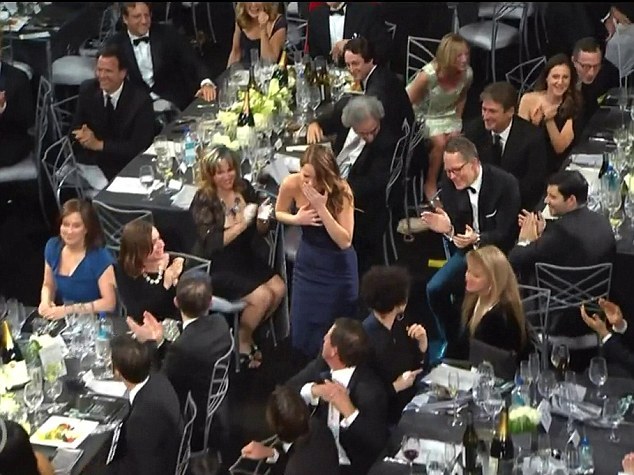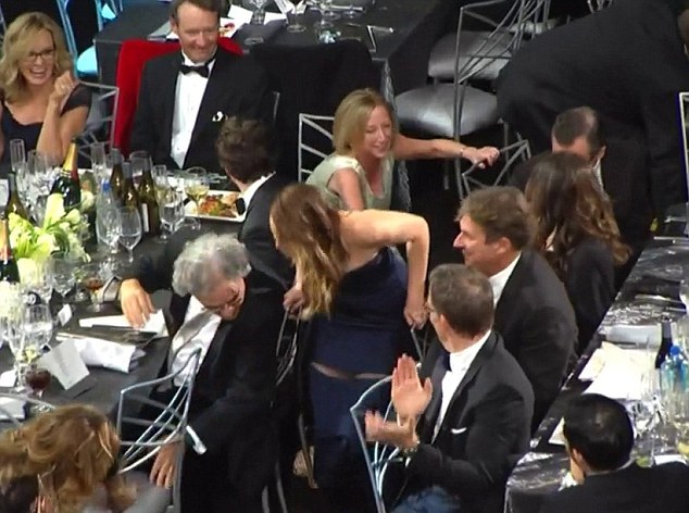 Φανερά συγκινημένη σηκώθηκε από την καρέκλα της για να παραλάβει το βραβείο της και άρχισε να αγκαλιάζει, να φιλάει και να δέχεται τα συγχαρητήρια από τους παρευρισκόμενους. Δεν πρόσεξε όμως ότι το φόρεμά της είχε πιαστεί στην καρέκλα κάποιου με αποτέλεσμα το μισό φόρεμα να ανέβει στα ύψη και να αποκαλυφθούν τα πόδια της.