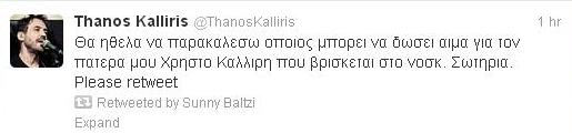Μάλιστα ο τραγουδιστής, μέσω Twitter έκανε έκκληση για αίμα, ώστε να βοηθηθεί ο πατέρας του.