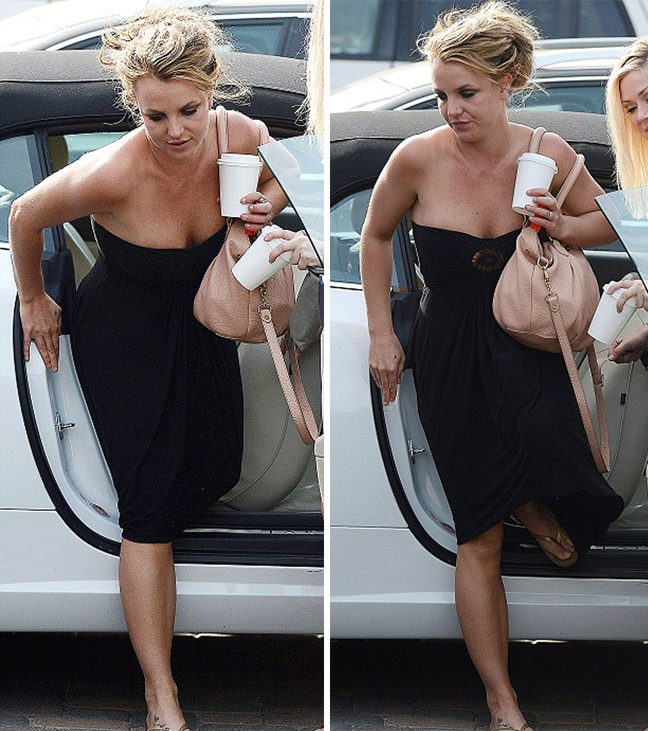 Μεγάλη δυσκολία να συγκρατήσει το στράπλες φόρεμά της είχε η Britney Spears στο Μαλιμπού. Το φόρεμα τής έπεφτε κάθε λίγο και λιγάκι και εκείνη προσπαθούσε συνέχεια να το τραβήξει προς τα επάνω για να μην αποκαλυφθεί το στήθος της.