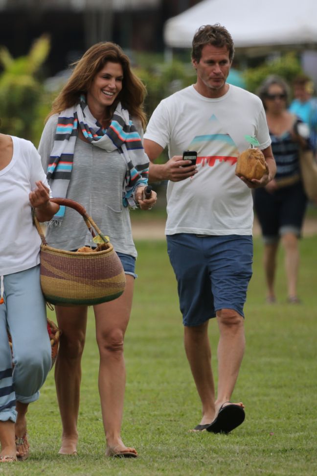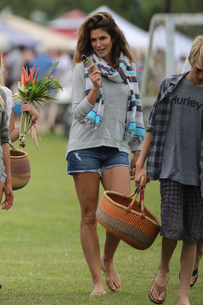 Και επειδή η άσκηση απαιτεί και σωστή διατροφή, η Cindy Crawford επισκέφτηκε στη διάρκεια των διακοπών της και υπαίθρια λαϊκή αγορά από όπου αγόρασε φρούτα και λαχανικά.