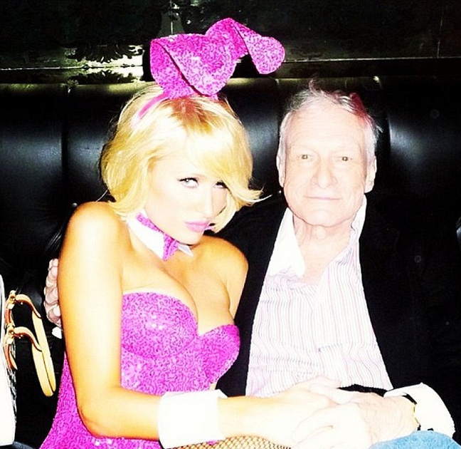 Η 32χρονη Paris Φόρεσε μια φούξια στολή με μεγάλα αυτιά και πόζαρε στην αγκαλιά του Hugh Hefner.