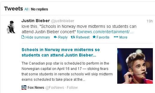 Ο καναδός ποπ σταρ έχει πολλούς φαν στην Νορβηγία και σε ένα μήνυμά του στο Twitter χαιρέτισε την απόφαση αυτή: «Μου αρέσει αυτό. Τα σχολεία στην Νορβηγία μεταθέτουν τις εξετάσεις ώστε οι μαθητές να μπορέσουν να πάνε στην συναυλία του Justin Bieber».