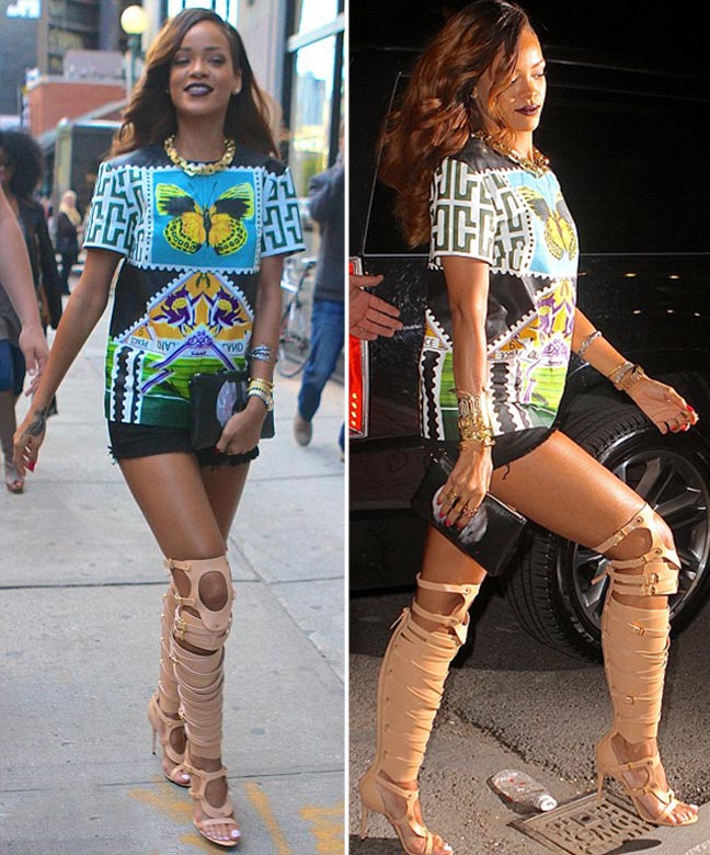Τα μπεζ πέδιλα μονομάχου της RiRi, φέρουν την υπογραφή του Tom Ford, όπως ήταν φυσικό δεν μπορούσαν παρά να τραβήξουν όλα τα φλας των φωτογράφων που είχαν στηθεί έξω από το ξενοδοχείο της Νέας Υόρκης όπου διέμενε και την περίμεναν.