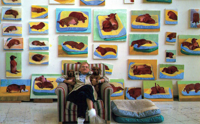 Ο Ντέιβιντ Χόκνι με τα δύο του ντάτσχαουντ, Stanley και Boodgie. O Άγγλος ζωγράφος, σκηνογράφος και φωτογράφος συνέβαλε σημαντικά στο ποπ-αρτ κίνημα και θεωρείται ένας από τους σημαντικότερους Άγγλους καλλιτέχνες του 20ού αιώνα.