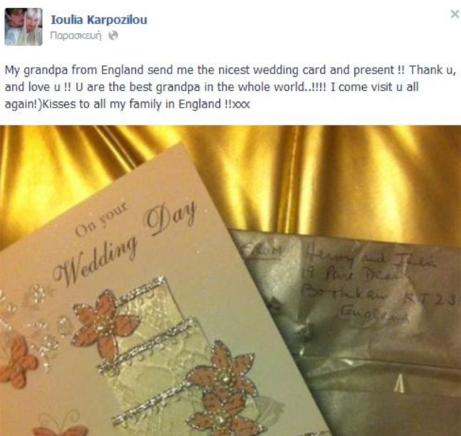 Ο παππούς της από την Αγγλία τής έστειλε μία γαμήλια κάρτα και ένα δώρο και η ίδια τον ευχαρίστησε μέσω του facebook. Μάλιστα του έγραψε πως σύντομα θα τους επισκεφτεί με τον σύζυγό της, Κριστιάν Καρποζήλο.