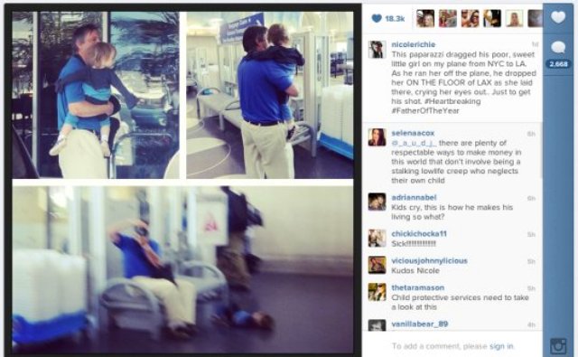 Το κυνήγι της αποκλειστικότητας από ορισμένους παπαράτσι δεν έχει όρια. Όπως αναφέρει η Νικόλ Ρίτσι, παρουσιάζοντας και τις σχετικές φωτογραφίες, ένας παπαράτσι πέταξε το ίδιο του το παιδί στο πάτωμα, προκειμένου να τη φωτογραφίσει.