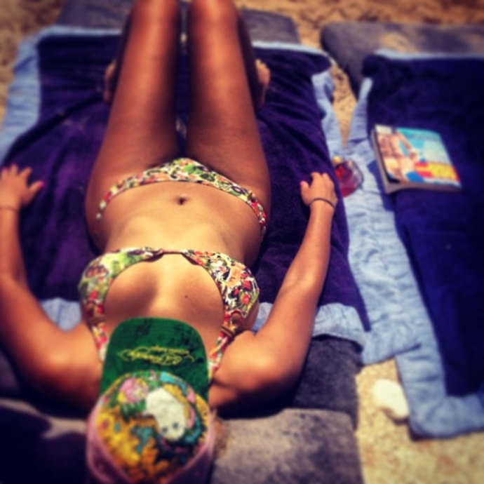 Αυτή τη φορά η παρουσιάστρια ανάρτησε μία φωτογραφία στην οποία εμφανίζεται να κάνει ηλιοθεραπεία με το πολύχρωμο μαγιό της, καθώς και μία δεύτερη από το σκάφος με το οποίο κάνει διακοπές, ενώ βρισκόταν στον Ισθμό της Κορίνθου.