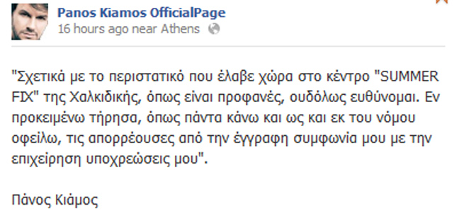 Καμία ευθύνη δεν φέρει ο τραγουδιστής Πάνος Κιάμος για το περιστατικό με την επαναλειτουργία του νυχτερινού κέντρου «Summer Fix» στη Χαλκιδική, όπως υποστηρίζει μέσω της σελίδας που διατηρεί στο Facebook.