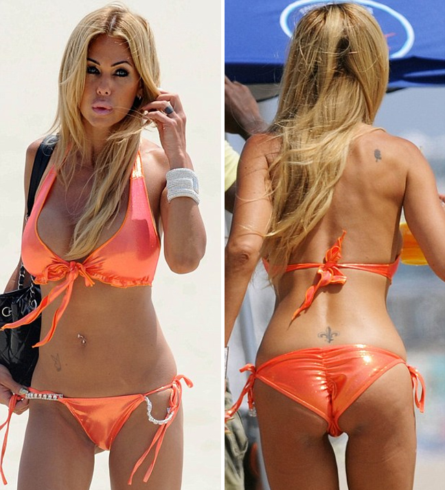 Η πρώην Playmate εμφανίστηκε σε παραλία του Λος Άντζελες με ένα σχεδόν ανύπαρκτο πορτοκαλί μπικίνι το οποίο συνδύασε με ασημένιους λαστιχένιους κοθόρνους.