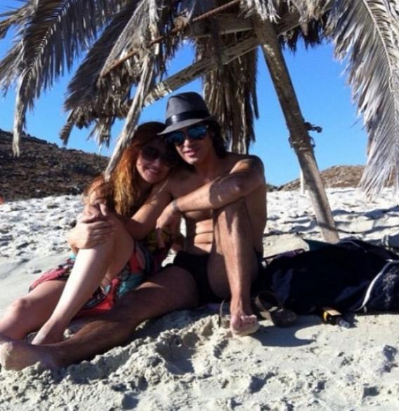 Το ζευγάρι εμφανίζεται να κάθεται αγκαλιασμένο κάτω από ένα δέντρο σε παραλία ενώ χαμογελάει στον φωτογραφικό φακό.