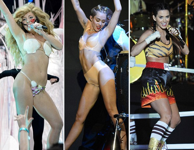 Οι τρεις καλλιτέχνιδες- που βρίσκονται στη φάση προώθησης των νέων τους άλμπουμ- επέλεξαν μικροσκοπικά σύνολα (της Lady Gaga αποτελείτο από… κοχύλια) ενώ η Lady Gaga και η Miley Cyrus τραγούδησαν φορώντας τα…. εσώρουχά τους- ή κάτι παρόμοιο. H Katy Perry me σορτς του μποξ και ένα κοντό τοπ ήταν, συγκριτικά με τις άλλες δύο, σεμνή.