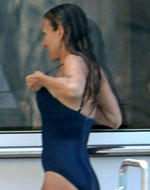 Ένα κλασσικό μπλε ολόσωμο μαγιό επέλεξε η Sarah Jesssica Parker για τις διακοπές της στο Αιγαίο.