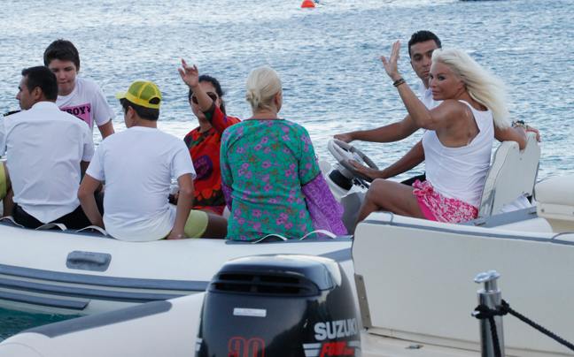 Ο φωτογραφικός φακός απαθανάτισε την ξανθιά καλλονή να κάνει βόλτα στα σοκάκια του νησιού φορώντας ένα λευκό φανελάκι κι ένα εμπριμέ παρεό, αλλά και να «αλωνίζει» στο Αιγαίο με φουσκωτό σκάφος.