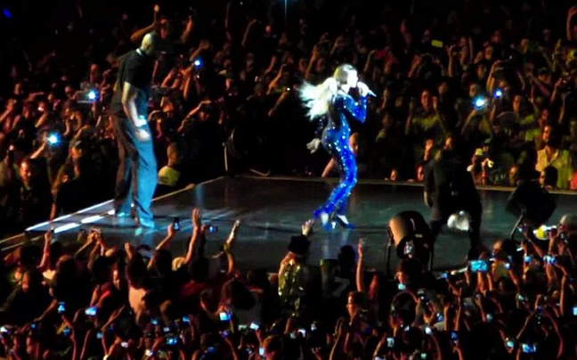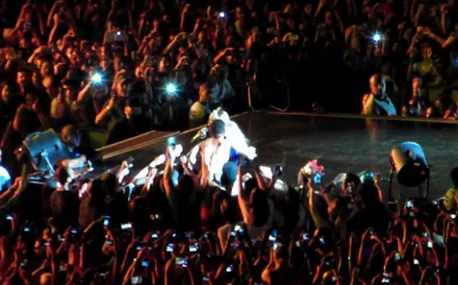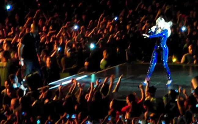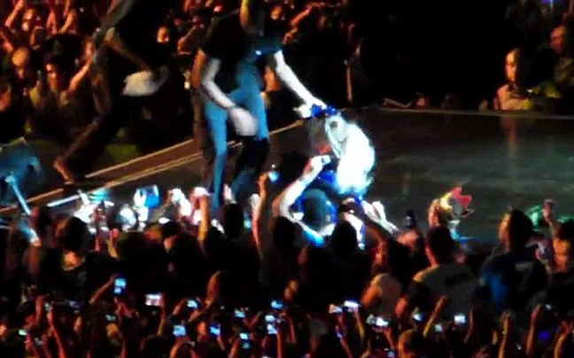 Ένας ημίγυμνος θαυμαστής της τραγουδίστριας ανέβηκε στη σκηνή τύλιξε τα χέρια του γύρω της και την «πέταξε» κάτω στο πάτωμα του γηπέδου.