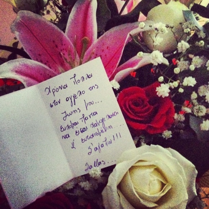 «Χρόνια πολλά στον Άγγελο της ζωής μου. Εύχομαι πάντα να είσαι χαμογελαστή κι ευτυχισμένη… Σ’ αγαπάω» έγραφε στην κάρτα της ανθοδέσμης που έστειλε στην Αγγελική Ηλιάδη ο Σάββας Γκέντσογλου.