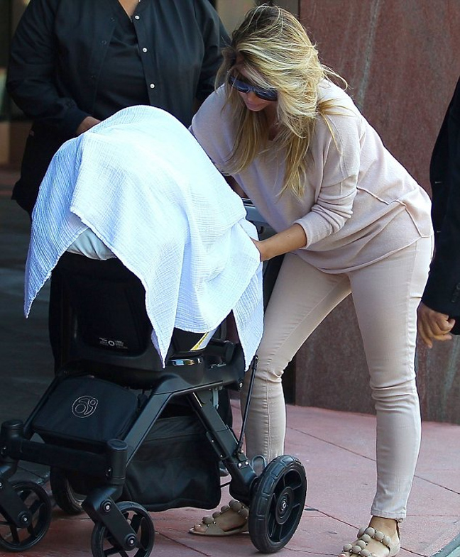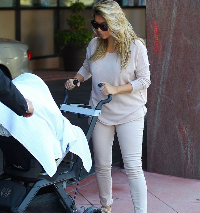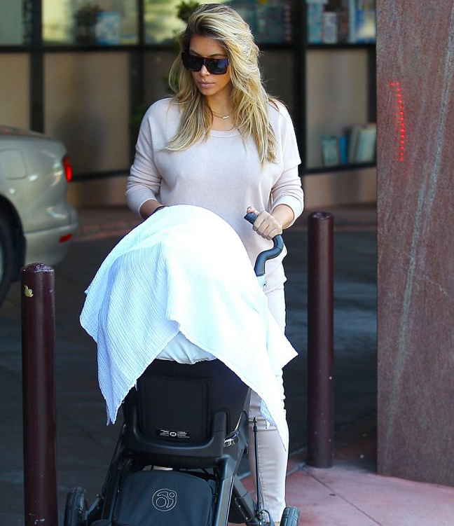 Στα ροζ ντύθηκε η Κιμ Καρντάσιαν για να βγει βόλτα με την κορούλα της την Πέμπτη. Η ριάλιτι σταρ εθεάθη μαζί με την κόρη της, North, και τον σύντροφό της Kanye West στο Μπέβερλι Χιλς. Παρόλο που μαζί τους ήταν η νταντά του μωρού και ο σωματοφύλακας της Κιμ, η σταρ δεν ήθελε να αποχωριστεί ούτε λεπτό το μωρό της και ήταν η ίδια που έσπρωχνε την κούνια. Η Καρντάσιαν γέννησε μόλις πριν 4 μήνες αλλά φαίνεται πως έχει ξαναβρεί τη φόρμα της.