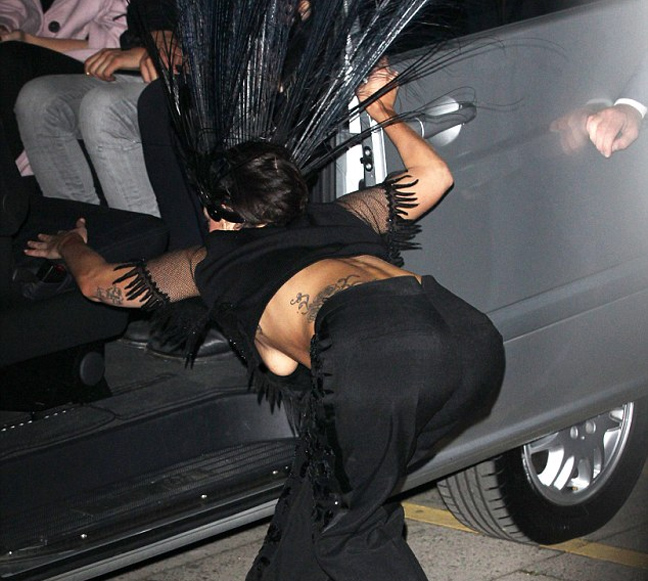 Έτσι, σκύβοντας για να μην χαλάσει τα μαύρα φτερά από παγόνι που στόλιζαν το κεφάλι της, δεν μπόρεσε να μην μας χαρίσει μια κλεφτή ματιά στο στήθος της που φάνηκε κάτω από τη μπλούζα της!
