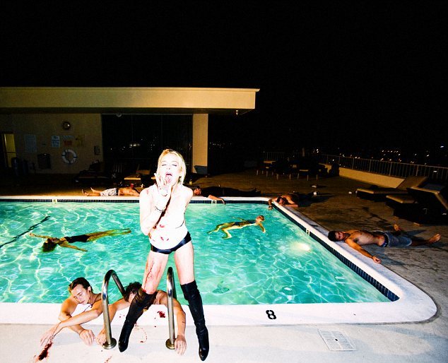 Σε αυτές, η σταρ ποζάρει φορώντας ένα κοντό σορτ, ενώ είναι λερωμένη με αίματα και κρατάει ένα μαχαίρι. Στη δεύτερη εικόνα και με ανάλογη αμφίεση και στυλ στέκεται μπροστά από μια πισίνα με πτώματα.