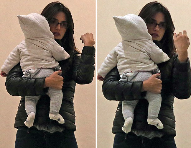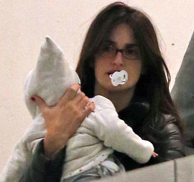 Η Penelope Cruz φαίνεται στις φωτογραφίες να έχει την πιπίλα της κόρης της στο στόμα, καθώς είχε τα χέρια της απασχολημένα, κρατώντας σφιχτά στην αγκαλιά της την μικρή Luna.