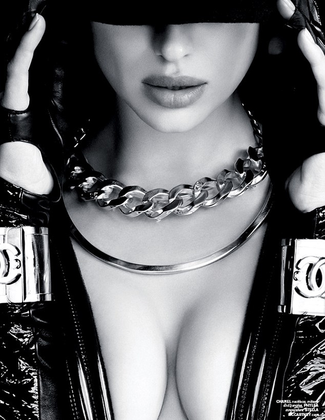 Σε άλλες φωτογραφίες, μια μεταλλική ζώνη βρίσκεται μπροστά στα μάτια του μοντέλου δίνοντας έτσι ένα φουτουριστικό τόνο στο concept της φωτογράφισης.